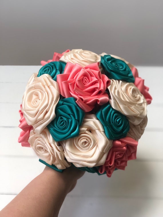 Coral Pink Ivory Champagne Satin Rose Festival Bouquet Custom
