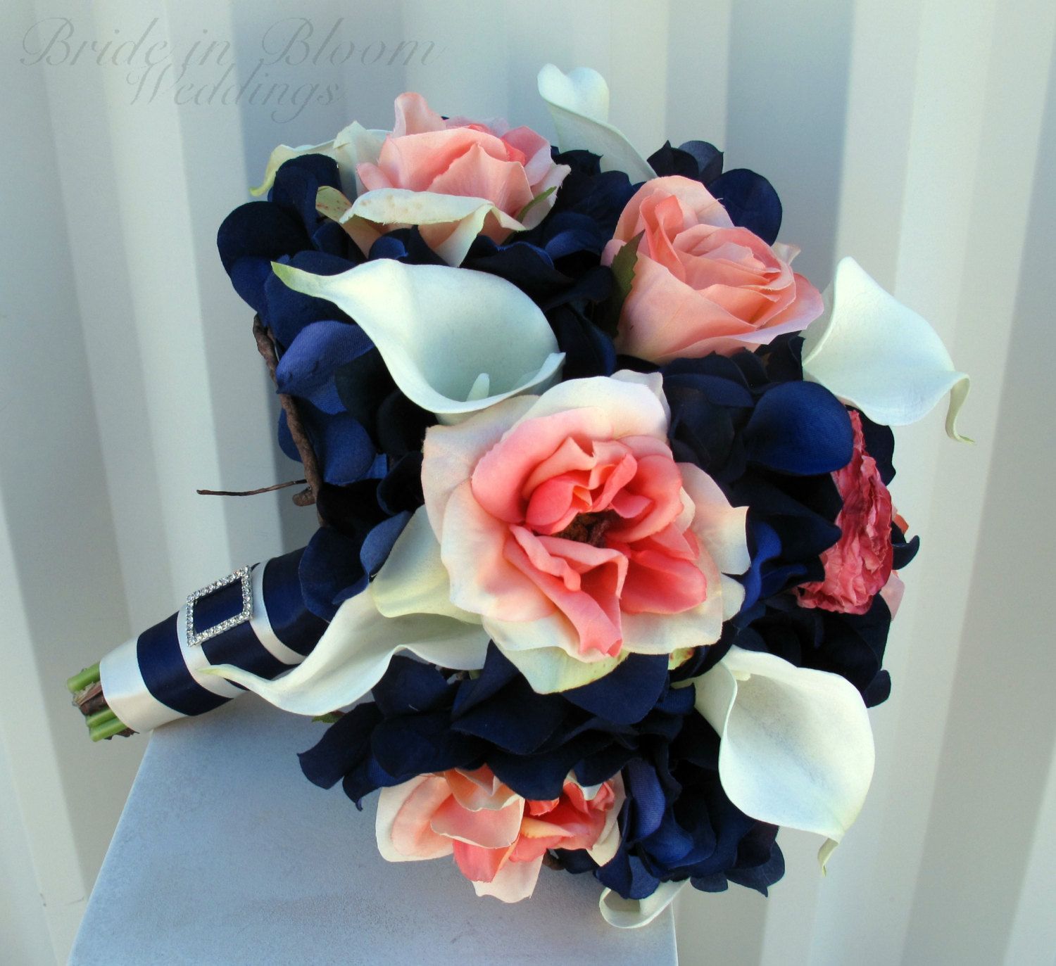 Wedding Silk Flower Bridal Bouquets 18 Pcs Package Navy Blue Coral