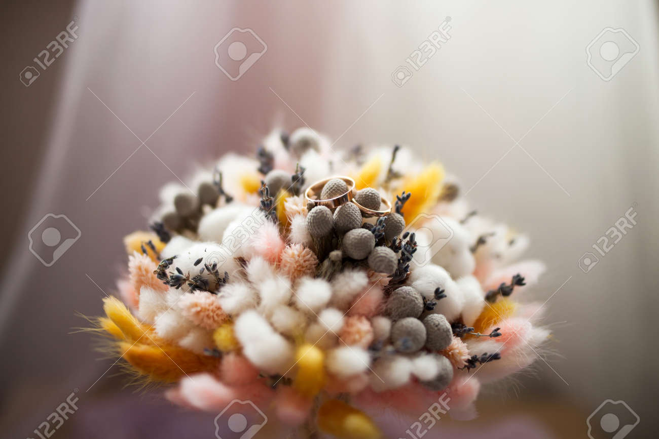 Wedding Rings On Bouquet Of Dry Flowers Rustic Style Autumn