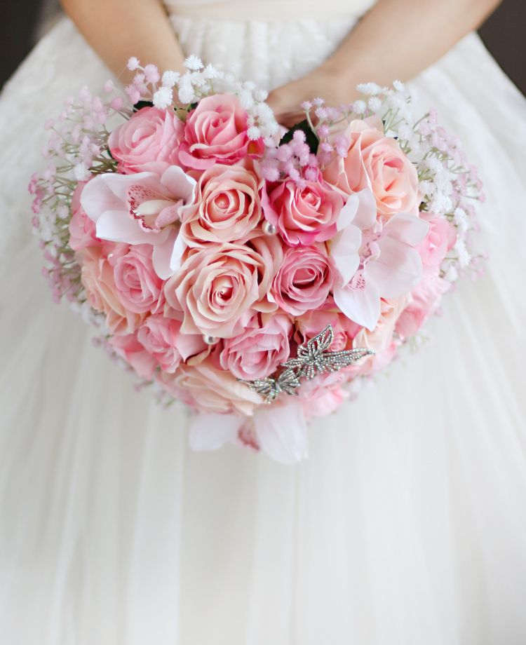 Janevini Heart Shaped Red Wedding Bouquet Silk Flowers Rose Pink
