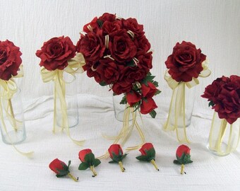 Red Rose Cascading Bridal Bouquet 12 Piece Set By