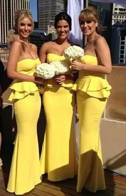 Chic Yellow Satin Bridesmaid Gowns Elegant Strapless Ruffles