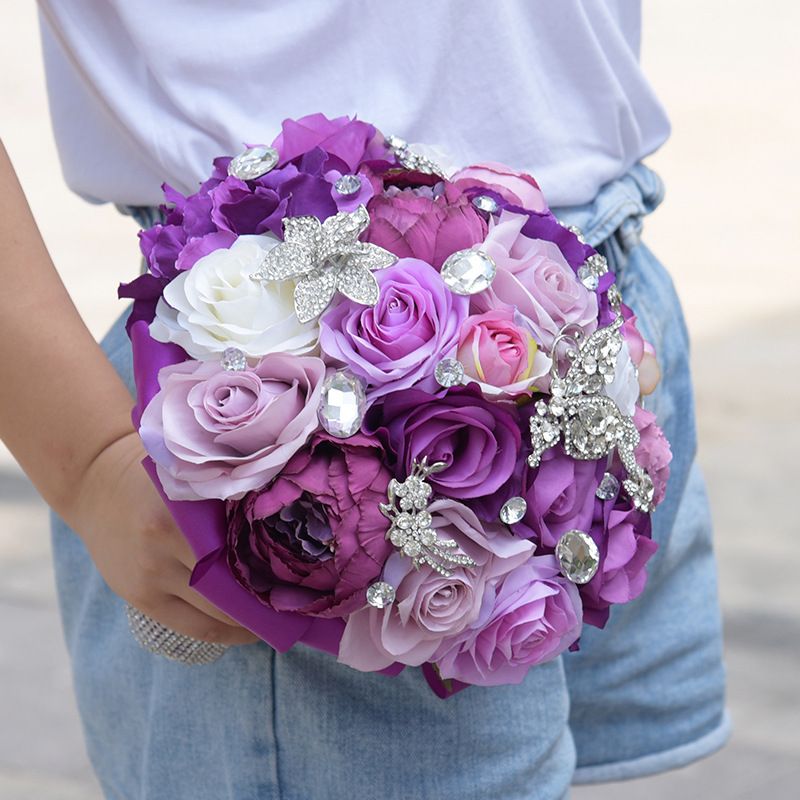 Artificial Purple Wedding Bouquets Handmade Flowers With Crystal
