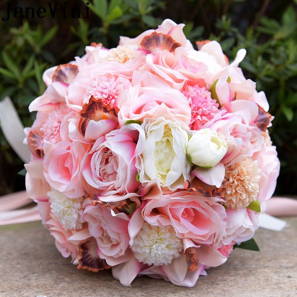 Janevini Crystal Pink Rose Wedding Bouquet Ivory Peony Silk