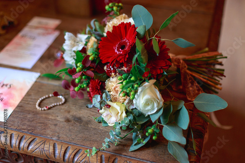 Wedding Bouquet Of Flowers Including Red Hypericum Roses Lilies