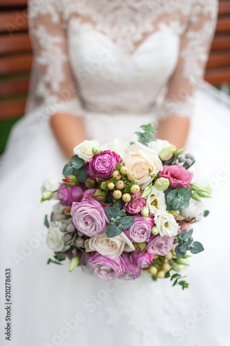 Wedding Bouquet Of Flowers Including Red Hypericum Roses Lilies