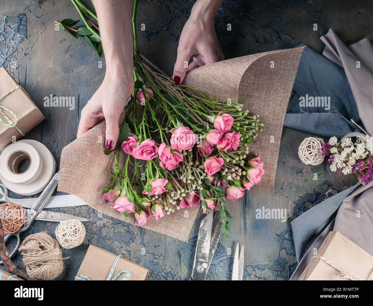 Work Process Of Florist Female Hands Making Wedding Bouquet On A