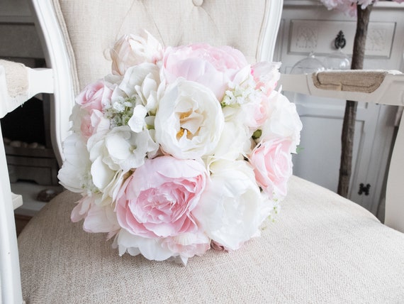 Silk Bride Bouquet White Cream Pale Pink Roses And Peonies Shabby