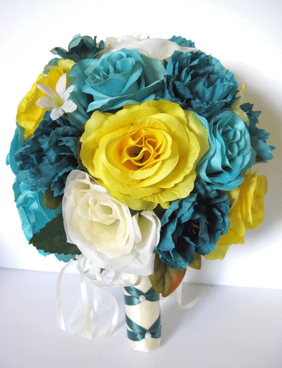 17 Piece Wedding Bouquet Set Bridal Bouquet Package Teal Aqua Etsy