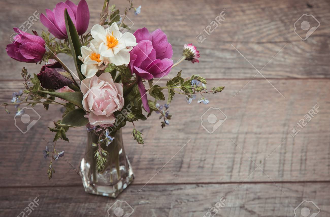 Beautiful Bouquet Of Spring Flowers Pink White And Purple Tones