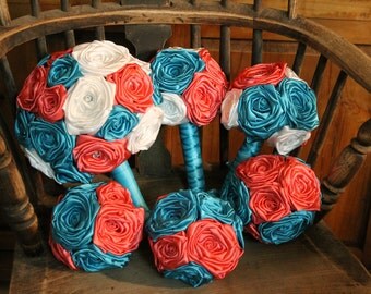 Wedding Bouquet Coral Gray Turquoise Ivory Bridal Bridesmaid