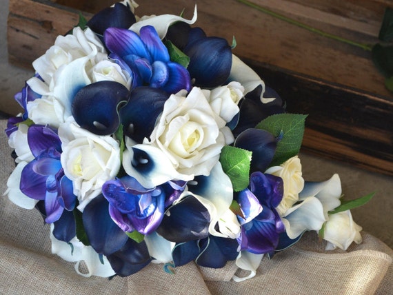 Navy Cascade Bridal Bouquet Real Touch Flowers Navy Blue Etsy