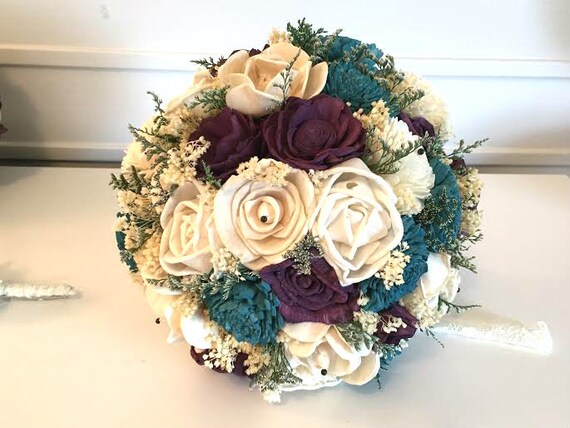 Purple and teal wedding bouquets wrapped in scrapbooking paper with ribbon. 1 brides bouquet 10 round with purple and ivory roses and teal hydrangeas and peacock feathers 1 matron of honor round bouquet 9 round. Mar 12 2018 explore reagens board wedding inspirations teal purple followed by 1013 people on pinterest.