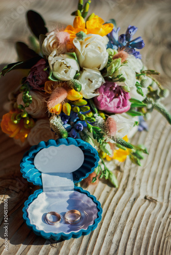 Bright Summer Wedding Bouquet Is Lying On The Wooden Bench Sun