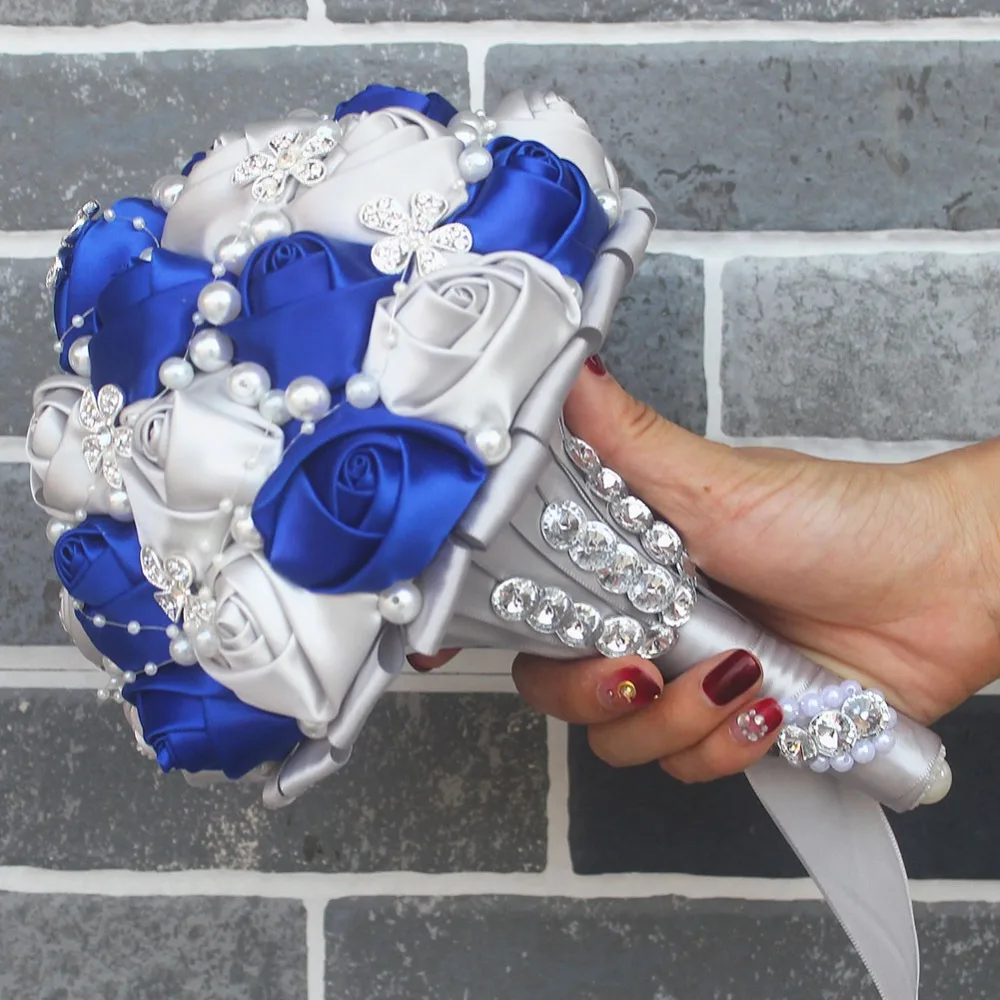 Royal Blue Artificial Rose Wedding Bouquet Wedding Ribbon Gold