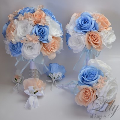 17 Piece Package Wedding Bridal Bouquet Silk Flowers Serenity Blue
