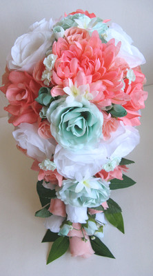 Silk Flower Wedding Bridal Bouquet Ivory Mint Coral Bride