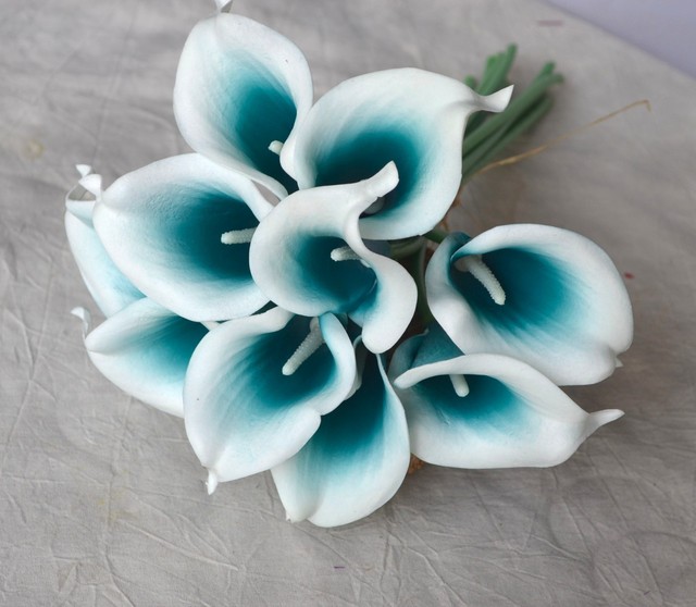 40pcs Teal Picasso Calla Lily Real Touch Flowers For Bridal