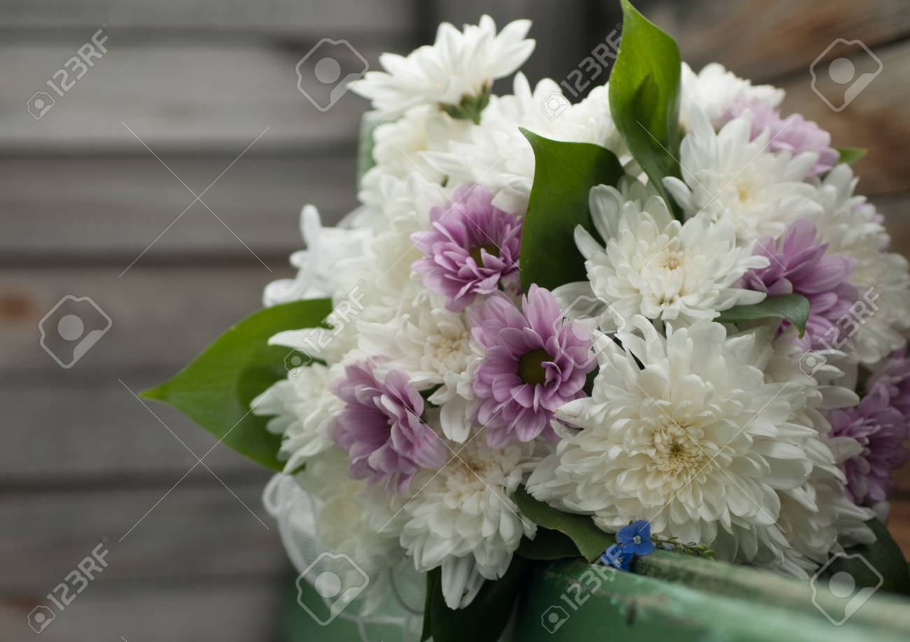 Wedding Bouquet Of Asters On The Background Of Old Wooden Boards