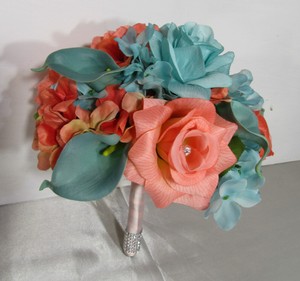 Coral Turquoise Rose Calla Lily Bridal Wedding Bouquet