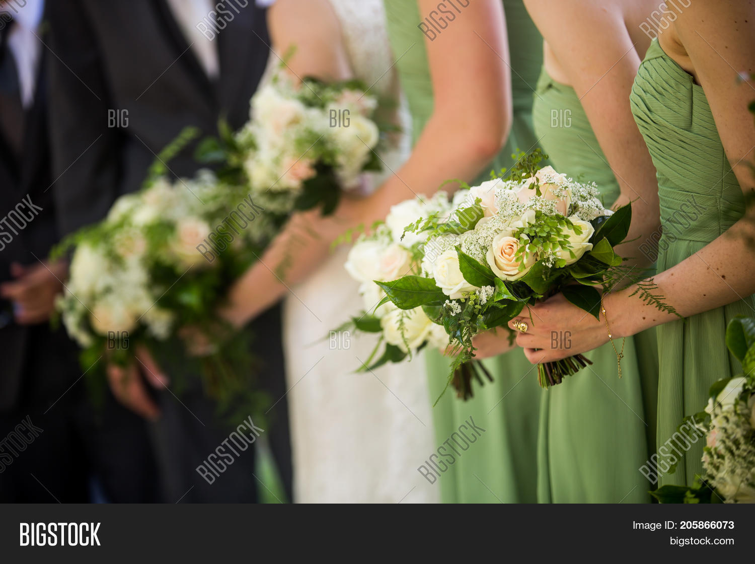 Bridesmaids In Light Pink Dresses With Pink And Green Bouquets