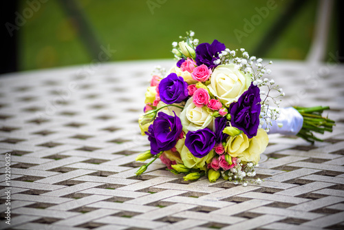 Wedding Bridal Bouquet With Pink And White Roses Lying On A Metal