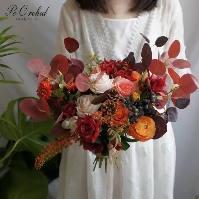 Peorchid Colorful Red Orange Big Bouquet Bridal Flowers Bridemaids