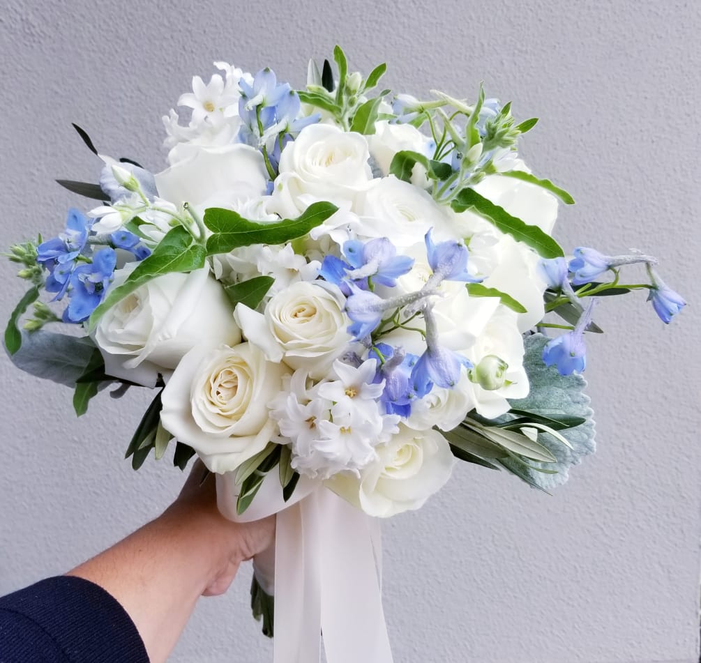 Pale Blue Delphinium Thistle And Dusty Miller Bouquet In 2020