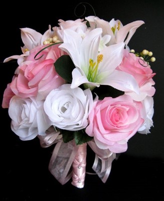 17 Piece Wedding Bouquet Bridal Bouquets Silk Flowers Pink White