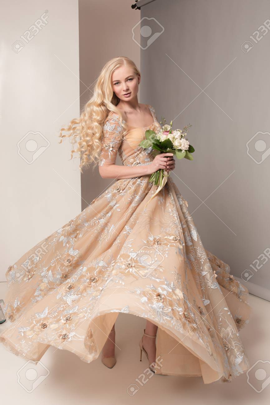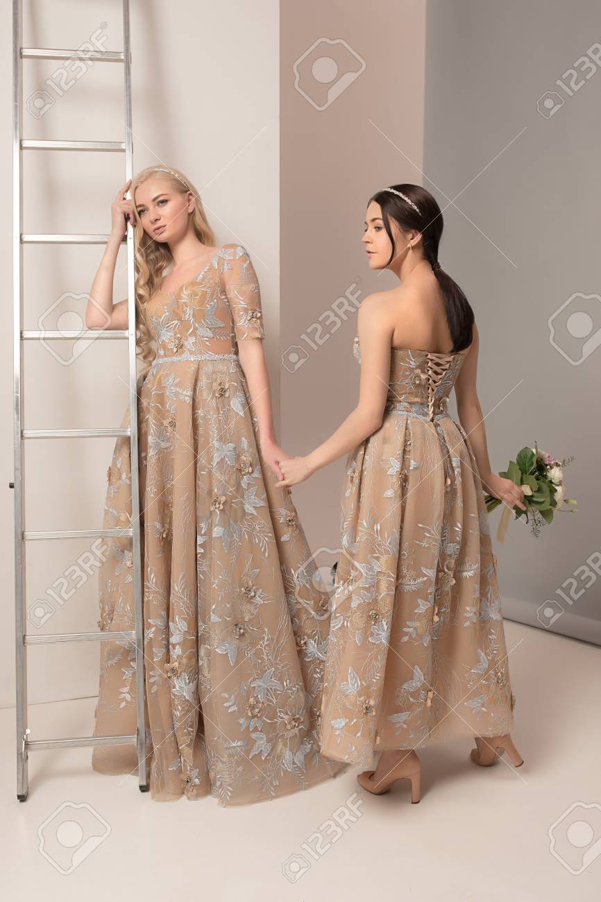 Brides In Beautiful Dress Standing Indoors In White Studio