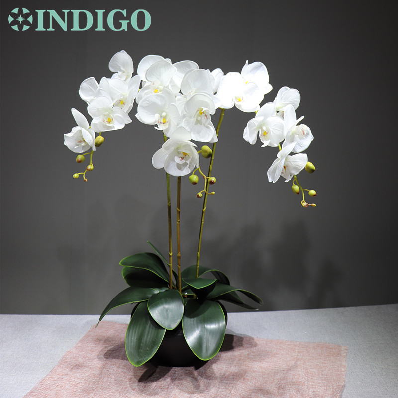 2019 Indigo White Orchid Flower Arrangment 90cm 3 Orchid 3 Leaf