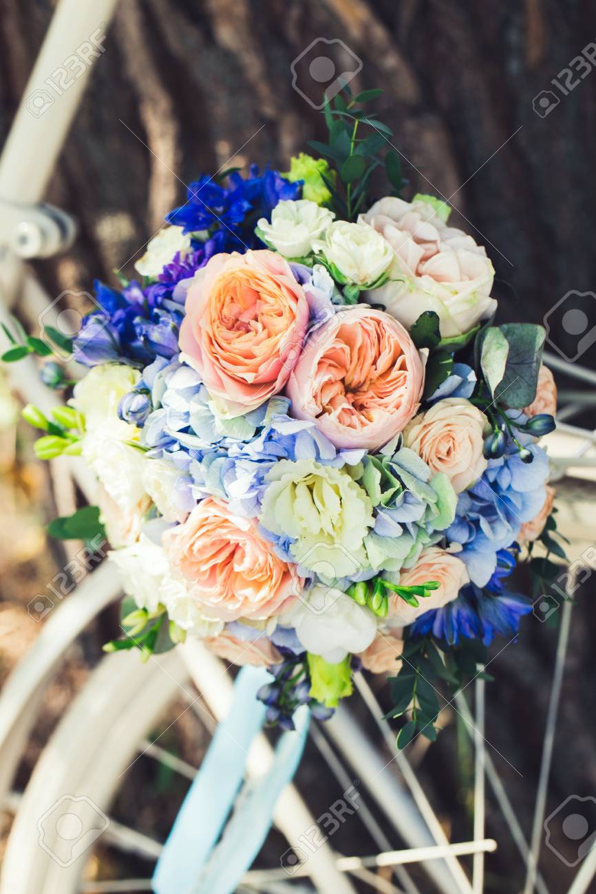 Wedding Bouquet Of Yellow And White Roses And Blue Fresia Lying On